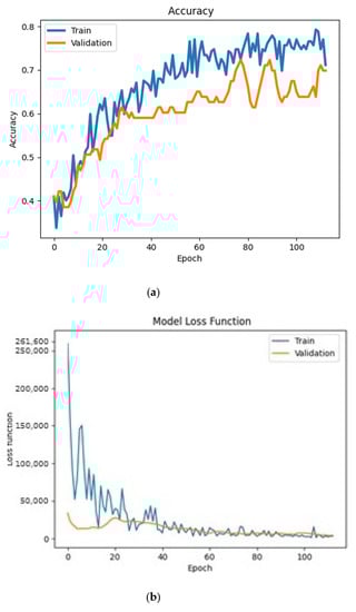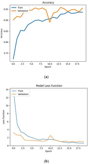 The network was taught in 20 epochs, with the following parameters: learning rate = 0.0005, and decay rate = 1 × 10−6. The learning results are shown in Figure 11. The accuracy of the network reached the value of 0.935 for the training set and 0.95 for the validation set after 15 epochs, which is a good result. The loss function, both for training and validation, reaches the value of 2 already after five epochs, and it stabilizes after passing 10 epochs. At the 10th learning epoch, there is a local maximum of the loss function, similar to the accuracy where a local decrease is also observed at the 10th epoch. The peak of this kind is a consequence of the use of batch size for the Adam algorithm. The batch dataset for the 10th epoch had to be misaligned for optimization reasons.