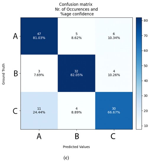 Results of the learning process of the primary neural network. From top to bottom: accuracy of the network, the loss function and the table of errors. (a)—approach phase, (b)—touchdown, (c)—stop.