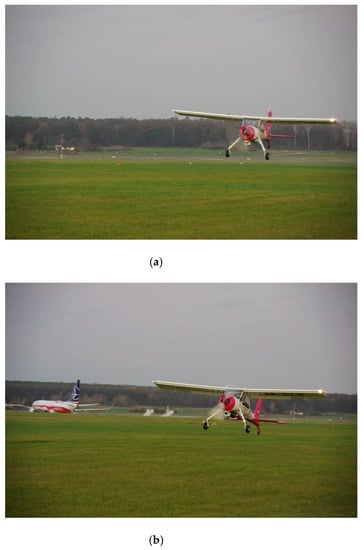 Figure 4 includes three photographs of the test airplane, showing three consecutive flight phases during one landing. A difference between the approach and the flare is clearly visible. It was impossible to recognize these two phases of flight on the basis of indications only from the accelerometer, therefore an additional sensor, a magnetometer, was used.