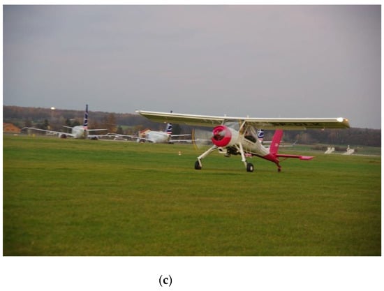 The flight test campaign took place at Lublin airport (ICAO Code: EPLZ), on a grass runway (the main runway of this airport has a paved surface). Flights were performed in November 2020, in the early afternoon. A total of over 50 flights were carried out, in which four people participated each time (two pilots and two people from among the authors of this paper, carrying out the measurements).