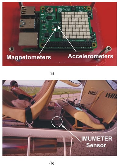 The IMUMETER sensor with accelerometers and magnetometers (a) and installation of the sensor in the test airplane (b).