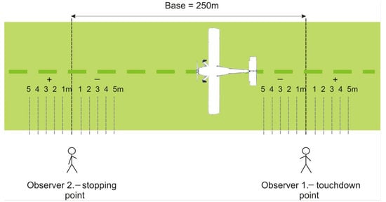 The preparation of the aircraft for the tests consisted of attaching the IMUMETER device (see Figure 5). A sample flight consisted of making a four-turn pattern and landing continued until the plane came to a stop. During the tests, the ground crew carried out measurements of the rollout length using a reference measuring method. Two observers on the ground are assessing the position of the aircraft at the time of touchdown and stopping, relative to established base points. After the measurement, the next flight took off. Figure 6 shows the measurements carried out on the runway.