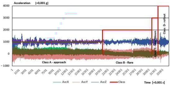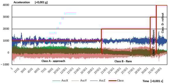 As during the fifth phase-stopping, the acceleration values do not change and their values remain the same as at the end of the fourth phase, for the sake of clarity the results are shown without the fifth phase. The data ranges for the individual phases of the flight are indicative (approximate). Determining class affiliation was performed manually. There are some changes in signal, which are characteristic features for a specific class, i.e., rollout class peaks with high amplitude are consequences of ground roughness.