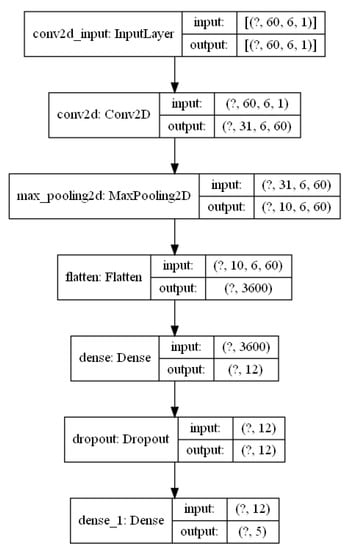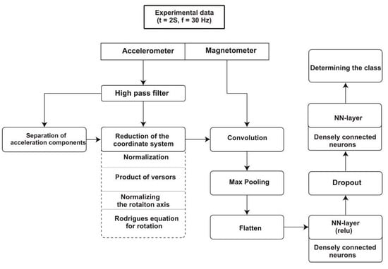 The input data to the neural network is preprocessed accelerometer data and raw magnetometer data from the period of time equals 2 s with a frequency of 30 Hz. So, the input data represent a matrix of size 60 × 6. Value 6 takes from 3 axes from the accelerometer and magnetometer. By further processing all the input data changes, we finally achieve a size equal to the number of classes.