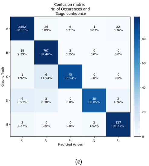 The confusion matrix reveals that the lowest degree of confidence occurs in class D—rollout and C—touchdown (80.85% and 86.54%, respectively). In the case of other classes, the degree of confidence is very high, reaching 95% or even more. The lowest values of correct predictions are for classes C and D. In 11.54% of cases, class C is falsely predicted as class B, while class D is predicted as A—8.51% and B—6.38%, and E—4.26%.