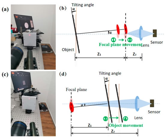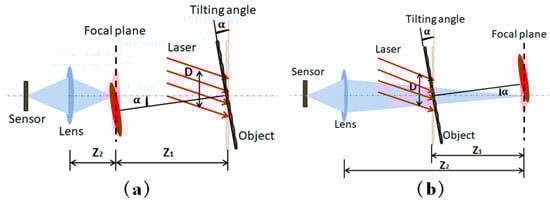 As shown in Figure 1a,b the camera is focused on the plane behind or in front of the object such that the object itself is defocused, respectively, where the focal plane is at a distance of .