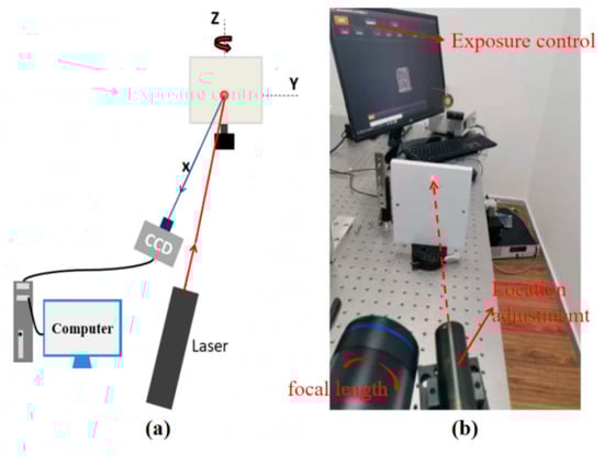 To verify the effectiveness of the proposed assessment criterion based on the CMZ, experimental speckle patterns at different defocusing degrees, exposure times, and surface roughness were evaluated, and results were compared with the MIG and the MIOSD. As shown in Figure 4a, the object was irradiated by a laser beam, and then the surface of the object formed bright spots and dark spots due to coherent subwaves interference. The defocused speckle pattern was captured by a charge-coupled device (CCD) camera and analyzed by the computer. Figure 4b shows the experimental setup. The laser power of the He-Ne laser was 20 mW, and the wavelength was 632.8 nm. Defocusing degree related to speckle particle size was controlled by focal length. Exposure time related to gray contrast was adjusted through camera software. In order to ensure different roughness at different measurement locations, uniform white paint was sprayed on the surface of the specimen, and then sandpaper was used to polish different parts in different degrees.