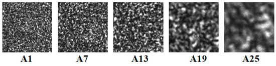 During speckle pattern acquisition, the defocusing degree was adjusted gradually, and the exposure time of the camera was then slightly adjusted around the value 8000 to retain the gray contrast. Twenty-eight speckle patterns (Group A: A1–A28, size: 256 × 256 pixels) with increasing speckle sizes were obtained, which are partially shown in Figure 5. In order to obtain deformed images with 0–1 pixel translation, sub-pixel shifted operation along the x-direction in the Fourier domain [34] was done. The step of translation was set to be 0.1 pixels. Decorrelation caused by big displacement or tilt should be avoided to ensure the validation of correlation calculation. Based on the DIC algorithm described in [46], the displacements of 81 points of each deformed image were calculated, and then the curves of the mean bias errors and the standard deviations of the displacements were obtained.