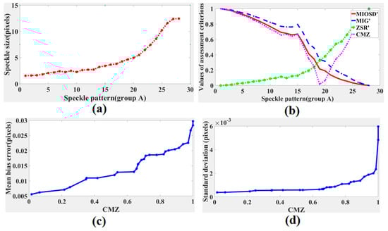 Results of speckle patterns in group A: (a) speckle size curve, (b) assessment criteria, (c) mean bias errors with different CMZ values, and (d) standard deviations with different CMZ values.