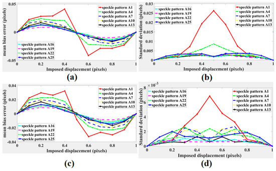The curves of the mean bias errors and standard deviations calculated with the subset of 31 × 31 pixels are shown in Figure 7a,c, respectively. The curves of the mean bias errors and standard deviations calculated with the subset of 61 × 61 pixels are shown in Figure 7b,d, respectively. The mean bias errors and standard deviations both decreased first and then increased, and the displacement calculation errors of pattern A19 were the lowest. The results were consistent with the results predicted by the proposed CMZ criterion. Furthermore, calculation with the subset of 61 × 61 pixels performed better. Therefore, choosing a larger subset can improve the calculation accuracy.