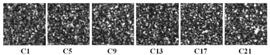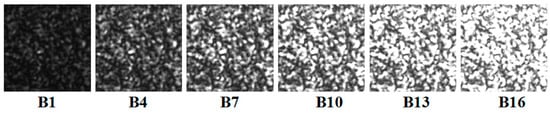 To obtain speckle patterns with different gray contrasts, the defocusing degree was unchanged, and the exposure time of the camera was adjusted from 1000 to 16,000 gradually. Sixteen speckle patterns (Group B: B1–B16) were obtained, which are partly shown in Figure 8, and then the same translation operation and displacement error calculation were performed.