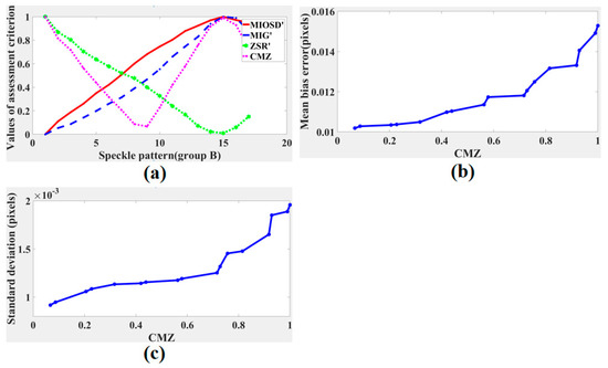 Figure 3a,b give the results of the speckle pattern series (a) and (b), respectively. We found that the values of MIG and ZSR undergo opposite changes with the speckle size increasing or the speckle density decreasing. We propose a new assessment criterion: the speckle pattern quality is higher when the normalized MIG and normalized ZSR are closer to the same value, which can also be understood as finding the intersection of the MIG and ZSR curves. Thus, neither MIG nor ZSR is too big, balancing the interpolation bias and random error. Based on this idea, a new parameter combining the MIG and the ZSR, named CMZ, is defined as