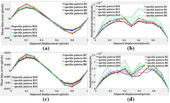 The curves of the mean bias errors and standard deviations calculated with the subset of 31 × 31 pixels are shown in Figure 10a,c, respectively. The curves of the mean bias errors and standard deviations calculated with the subset of 61 × 61 pixels are shown in Figure 10b,d, respectively. The mean bias errors and standard deviation both decreased first and then increased, which verified that the contrast of speckle patterns will be reduced due to overexposure or underexposure, causing decline of speckle pattern quality. According to displacement calculation errors, pattern B6–B10 perform better, which was closer to the result predicted by the proposed criterion CMZ. Similarly, calculation with the subset of 61 × 61 pixels performed better.