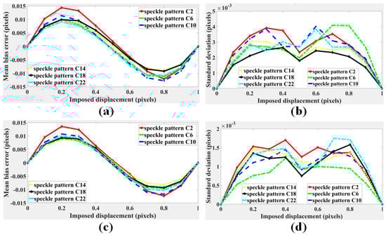 (a) Mean bias errors and (b) standard deviations of speckle patterns displacements in group C calculated with the subset of 31 × 31 pixels. (c) Mean bias errors and (d) standard deviations of speckle patterns displacements in group C calculated with the subset of 61 × 61 pixels.