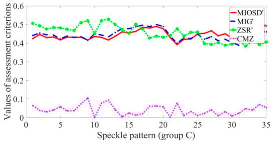 The results for different assessment criteria are shown in Figure 13. The MIG, MIOSD, ZSR, and CMZ values all remained stable, which is consistent with the displacement calculation results presented in Figure 12. Thus, the surface roughness of the object has little effect on its speckle pattern quality. High laser speckle pattern quality depends on suitable speckle size and gray contrast, which can be controlled by defocus degree and exposure time and so on. When the gray contrast is unchanged and the speckle size keeps within a suitable range, the displacement calculation accuracy of the laser speckle pattern remains stable with different speckle particle distributions.