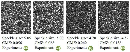 Four speckle patterns from the different experiments, their speckle sizes, and their CMZ values.
