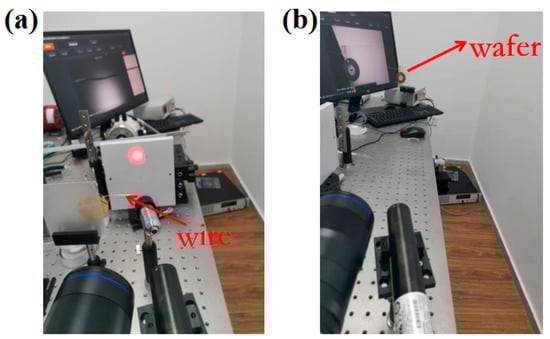 As shown in Figure 16, we used an object with a known size, such as a wire or wafer, to find the focal plane where the acquired image was clearest. The camera magnification factor was calculated through the real width of the wire or wafer and its corresponding pixel width. The rotation angle resolution, which was defined as the calculated displacement at the focal plane when rotating 1′, could be obtained through the magnification factor and the distance between the object and the focal plane. In the four experiments, we adjusted the rotation angle to acquire different speckle patterns, and then displacement fields containing 100 calculated points at the focal plane were calculated by normal DIC algorithm. Mean displacement of each speckle pattern was eventually converted to the measured angle using Equation (4). The range of the rotation angle was 4’–20’, and the step of rotation was set to be 2’.