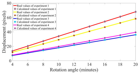 For all rotation angles, the real displacements at the focal plane are plotted as a line and the calculated displacements are plotted as scatter points in Figure 17, and results of the different experiments were all in good agreement. The angle resolution was considered to be the slope of the best fit line to the scatter points.