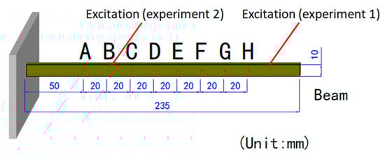 Two real vibration experiments were conducted to further evaluate accuracy of the laser speckle correlation method. Using the same measurement system, a vibrating beam was used as the measured object. The vibration signal was passed through the signal generator, to the amplifier, and finally to the cantilever beam. To ensure that the speckle sizes were all around 5 pixels, the defocusing degree was determined using Equation (4), and then the exposure time was adjusted to ensure a low CMZ value to acquire a speckle pattern with a high quality. The size of the vibrating beam was 235 mm × 10 mm, as shown in Figure 18. Eight points (A–H) were measured in turn, where the distance from point A to the fixed end was 50 mm and the interval of the measurement points was 20 mm. The first experiment is illustrated in Figure 19a. At a distance of 30 mm from the free end, a simple harmonic excitation was applied to the cantilever beam with a frequency of 10 Hz, which was close to the first-order natural frequency of the beam. In the second experiment, which is shown in Figure 19c, the simple harmonic excitation was applied to point B with a frequency of 30 Hz. One speckle pattern coming from each experiment and the corresponding CMZ values are given in Figure 19b,d respectively. The laser power of the He-Ne laser was 20 mW, and the wavelength was 632.8 nm. However, the size of acquired speckle pattern was set to be 256 × 256 pixels to achieve a high sampling rate. The sampling rate was 2000 Hz, and the sampling time was 0.5 s. Meanwhile, laser doppler vibrometry (LDV) with a sampling rate of 40,000 Hz was used to collect the vibration signals. Finally, the calculated results of the speckle correlation method were compared with the signal processing results of the Doppler vibrator.