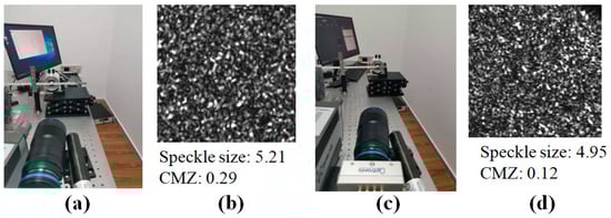 Considering the vibration information is obtained from tilt angle, rotation experiments were first designed to test angle calculation accuracy and further verify the proposed quality assessment. Besides, different relative distances between the object, the focal plane, and the sensor plane were adopted, which corresponded to different defocusing degree, so as to illustrate the relationship between defocusing degree and the angle resolution. The schematic diagram of the rotation experiment is shown in Figure 4a. A square measured plate was placed on a rotary platform, and the position accuracy was 2′. The plate was irradiated by a laser beam, and then the defocused speckle pattern was acquired by a CCD camera. The laser power of He-Ne laser was 20 mW, and the wavelength was 632.8 nm. We conducted four experiments. In two, the measured object was placed behind the focal plane, and in the other two, the measured object was placed in front of the focal plane, as shown in Figure 14a,c. In the two experiments with the object in front (shown in Figure 14b we changed the focal plane by adjusting the focal length slightly and keeping the other parameters fixed. In the two experiments with the object behind (shown in Figure 14d, only the location of the object changed. Based on the optimal speckle size determined by experience, the relative distances were first determined according to Equation (3) to ensure that the speckle sizes were all around 5 pixels. Next, the exposure time of the camera was adjusted to ensure a low CMZ value, because a low CMZ value corresponds to a high quality of the speckle pattern. The four speckle patterns given in Figure 15 are from the four different experiments. The speckle sizes and CMZ values of these speckle patterns were also calculated and are shown. The CMZ value of the third experiment was highest due to its low gray contrast. The CCD camera was a CP70 1HS M/C (Optronis, Germany). The physical size of the CCD sensor was 17.536 × 11.782 mm, and the size of the acquired speckle pattern was 1280 × 860 pixels.