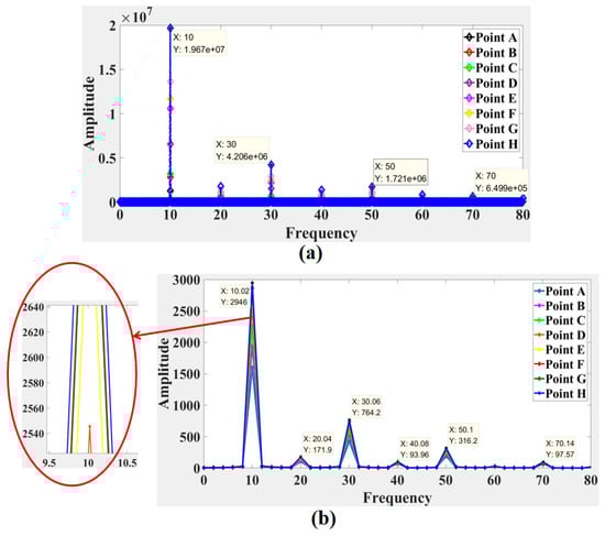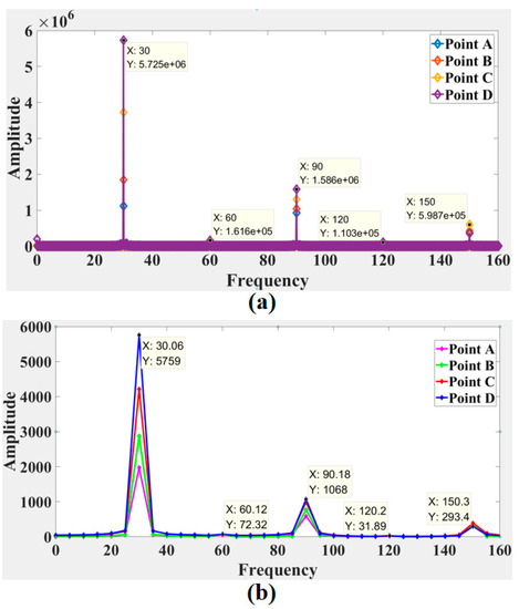 Figure 20a and Figure 21a show the frequency spectrum results from the two experiments obtained by the LDV, and Figure 20b and Figure 21b show the frequency spectrum results from the two experiments calculated by the laser speckle correlation method. The focus of this study was the response frequency, so the pixel displacement was not translated into a physical displacement. The calculated response frequencies of the two methods were in good agreement, and response frequencies showed no obvious difference at different tested location. In the frequency spectrum of the first experiment, a primary energy peak at 10 Hz. Several secondary energy peaks were present at 20 Hz, 30 Hz, 40 Hz, and 50 Hz. The response frequency error of the laser speckle correlation method increased from 0.02 Hz to 0.1 Hz. Similarly, the second experiment showed primary peak at 30 Hz. Secondary peaks happened at 90 and 150 Hz, respectively. The response frequency error of the proposed method increased from 0.06 Hz to 0.3 Hz.