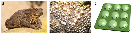 (a) Picture of a toad. (b) Warty texture of a toad’s skin. (c) Schematic of bioinspired pressure sensor arrays with spherical bumps. The black lines are strain gauges.