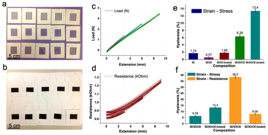 (a,b) Pictures of sample #1 to #25 fixed in cardboards. They were rowed as in Table 2. (c) The extension-load curves of sample #1. (d) the extension-resistance curves of sample #25. (e) Mechanical hysteresis of all the samples. (f) Comparison between mechanical and electromechanical hysteresis of the samples.