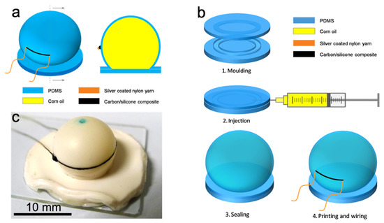 A schematic diagram of the cell-type pressure sensor is shown in Figure 3a. The cell made from PDMS was filled with corn oil. The cell size can be adjusted by the volume of oil. On the cell wall, a carbon/silicone strain gauge was printed along the equator. Owing to the incompressibility of oil, when the cell was under compression, its equator was expected to expand greatly, leading to a stretch on the strain gauge. There were SCNYs connecting the strain gauge to external devices for resistance recording.