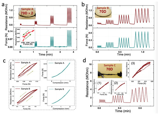 The three sensor samples were evaluated using the same coupled electromechanical setup as in Section 3. A load was applied where the specimen was compressed by 0.5–2.0 mm and released for five cycles. There were one-minute or ten-second intervals between the compression groups. A loading and unloading speed of 60 mm/min was used for all the cycles.