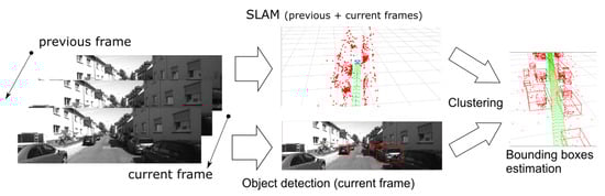 Since object detection algorithms that do not use SLAM results must perform simultaneous spatial localization and orientation of objects, solutions that are proposed in the literature create much more complex deep architectures than are required in practice to solve the simultaneous SLAM and OR problem. In practice, in recent studies, authors use a variety of deep architectures to perform simultaneous detection and spatial orientation of objects. These approaches use the generation of pseudo-LiDAR data [], generating pseudo-depth data [,] or explore various 3D structure information of the object by employing the visual features of visible surfaces and 2D to 3D reprojection [,,,,,]. The algorithm proposed in our work, by using data from SLAM has the ability to use general purpose DNNs, which are easier to train due to the availability of multiple training datasets and have a larger capacity for different classes of objects. Algorithms that are present in the literature that perform the OR and localization task allow us usually to work with one class of objects at a time (e.g., only with cars, cyclists, etc.). All these facts make the SLAM-OR algorithm proposed in this work a new and useful approach that can be used when we need to perform both SLAM and OR task simultaneously.