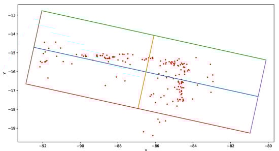 This figure presents example results of objects bounding box calculation using PCA—based approach from Equation (13). Values on the X and Y axis are points coordinates calculated by our algorithm. The scaling of the axes is irrelevant because PCA normalizes variables. Red points are directly calculated from SLAM algorithm. Blue section lays along direction of the highest variance of red points (the first principal component ). Orange section is perpendicular to blue section and it lies along direction of the second highest variance of red points (the second principal component ). The bounding box have four edges: violet (), green (), brown () and red ().