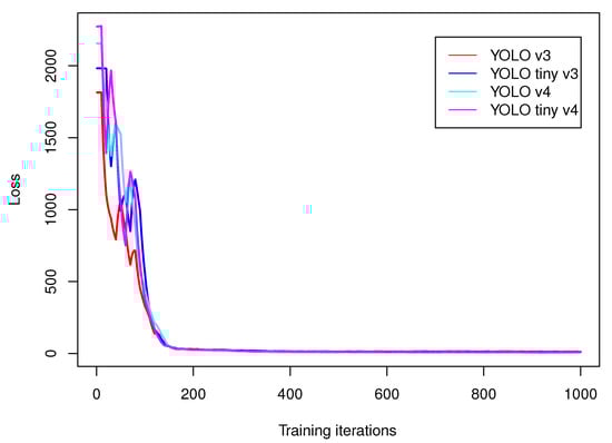 Application of DNN has revolutionized image-based procedures of features generation, objects detection and recognition [,]. This brain-inspired machine learning algorithms [,] have found their application, i.e., for security purposes (face detection, vehicle detection) [,,], they are used in autonomous cars to recognize the environment [], in medicine [] etc. CNN are robust and relatively fast architectures that with an aid of GPU-based acceleration can be trained to serve in various images domains. Most popular objects detection and recognition models such as R-CNN [], SPP-NET [], Fast-RCNN [], SSD [], RetinaNet [], and YOLO [] have ability to recognition objects in real time what makes them applicable in many practical real life (not only experimental) scenarios. In contrary to pure-classification (objects recognition) architectures like VGG16 [], InceptionV3 [] or ResNet [] objects detection and recognition models are capable to also detect (indicate position in raster images) of many objects simultaneously in real time. The newest versions of YOLO network (namely YOLO v3 and YOLO v4 []) seems to be very promising approaches which over perform other state of the art solutions both in detection quality and processing speed.