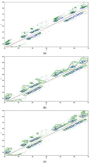 In Figure 4, we present example influence of application of various DBSCAN parameters on detected objects bounding boxes on fragment of the dataset Kitti 39. Black dots are the reference vehicle path, red dots are the mapped path (they nearly overlap), blue boxes are vehicles positions, green dots are the point cloud of potential objects detected by the SLAM-OR approach, green boxes are estimations of objects’ positions estimated by our approach presented in Section 2.7.