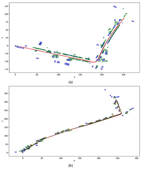 In Figure 5, we present the example results of SLAM-OR bird’s eye maps that contain both estimated vehicles tracks and recognized object boxes. Those images present SLAM-OR results with DBSCAN parameters: eps = 1 and min samples = 5. The black path and blue rectangles are reference data. Red lines and green rectangles are results of the SLAM-OR. Both previously mentioned figures were generated for YOLO v4 network—MobileNet and RetinaNet generate very similar results.