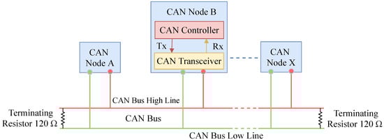 During the development of the CAN bus protocol, vehicles were considered as isolated objects that did not have a connection with the outside environment []. By design, the CAN bus protocol is plagued with various security issues because of the lack of encryption and authentication requirements []. Therefore, any malicious or hijacked node can cause disastrous accidents and serious financial loss. For instance, hackers can affect an ECU by injecting malicious messages and various attacks due to the lack of an efficient message authentication method. The CAN node is the combination of a CAN controller and a CAN transceiver that transmits and receives messages but not simultaneously []. The architecture of a CAN bus node is shown by Figure 1. The data frame, remote frame, error frame, and overload frame are four different types of frames that have been used in the CAN bus [,]. The data frame is used to transmit actual data from a transmitter to receivers (other nodes). A node requests a specific message with a specific identifier using the remote frame. If any of the nodes on the bus detects an error, it will send an error frame. The overload frame adds a delay between the data and remote frames.