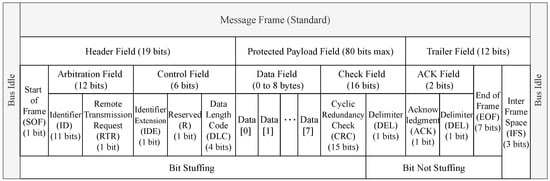 The standard CAN message frame format is the composition of header, trailer, and protected data payload field that can be up to 64 bits long. The header field is the combination of 1-bit Start of Frame (SOF), 12-bits arbitration field, and 6-bits control field. Furthermore, the arbitration field divided into an 11-bits identifier and 1-bit Remote Transmission Request (RTR) field. The identifier field represents the message priority. It also consists of Identifier Extension (IDE), Reserved, Data Length Code (DLC), Cyclical Redundancy Check (CRC), Delimiter, Acknowledge (ACK), End of Frame (EOF), and Inter Frame Space (IFS) fields. Both sides of the message frame end with a bus idle field. Figure 2 shows the standard CAN message frame format [].