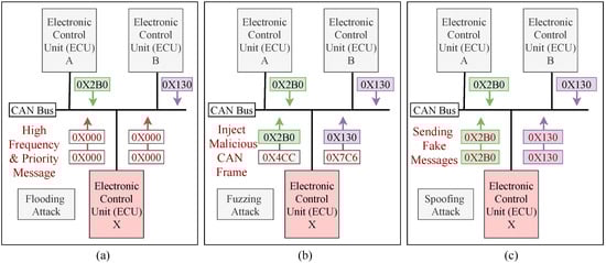 (a) Flooding attack scenario against an IVN; (b) Fuzzing attack scenario against an IVN; (c) Spoofing attack scenario against an IVN.