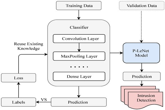 The block diagram of the proposed P-LeNet model is shown in Figure 5, which contains two parts: the model training part and the intrusion detection part. After pre-processing the raw data, we have applied it to our proposed model for training. Through subsequent empirical experiments, the most important parameters for the selected model have been determined. We used a randomly selected training dataset to train the proposed P-LeNet model and a validation dataset to validate the model. The final IDS model has been selected based on its best prediction performance on the validation dataset.