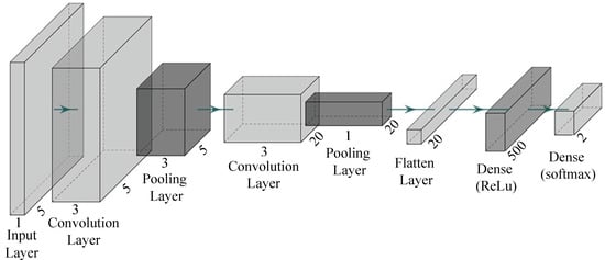 The proposed P-LeNet architecture is made up of seven layers with a total of 12,052 trainable parameters (weights). The layer is the composition of two convolutional layers, two subsampling layers, one flatten layer, one fully connected layer, and one output layer. Each layer takes the previous layer outputs as inputs for the current layer and performs some nonlinearity’s to transform it into a multivariate series whose dimensions are defined by the number of filters in each layer. The structure of the proposed LeCun Network (P-LeNet) model is shown in Figure 6. The first layer is the Input layer, which is not considered a network layer because it does not learn anything. The input layer is designed to take dataset and pass it on to the following layer. The dataset has a total of four features including the label feature. The four features are CAN_ID, DLC, Data_Field and Label. The one-dimensional convolutional layer (Conv1D) is used in the first, and the third layer respectively to transform the dataset. The first Conv1D layer produces as output five feature maps, and has a kernel size of 5, and the second Conv1D layer produces as output 20 feature maps, and has a kernel size of 5. The Rectified Linear-Unit (ReLU) activation function is used in the both convolution layer. The two Conv1D layers contain 30 and 520 trainable parameters, respectively. The first MaxPooling1D subsampling layer follows the first Conv1D layer, and the second MaxPooling1D subsampling layer follows the second Conv1D layer shown in Figure 6. The two subsampling layers halves the dimension of the feature maps it receives from the previous layer; this is known commonly as down-sampling. The two subsampling layers also produce 5 and 20 feature maps, respectively, each one corresponding to the feature maps passed as input from the previous layer. The fifth layer of our proposed model is the Flatten layer which converts the pooled feature map to a single column that is passed to the next layer. The next is fully-connected Dense layer where total trainable parameter is 10,500. This operation reduces drastically the number of trainable parameters in a deep model while enabling the use of a class activation map which allows an interpretation of the learned features []. Finally, the output layer whose number of neurons is equal to the number of classes in the dataset. The softmax function is used as the activation function in this layer to predict a probability distribution between normal and attack scenarios.