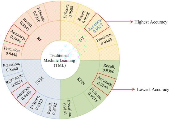 We start with the traditional machine learning (TML) algorithms because these state-of-the-art algorithms provide the optimal performance and take the least amount of time to run. The performance of the selected TML algorithms has been quantitatively evaluated using the fundamental evaluation indicators. Figure 9 shows the performance metrics of the selected TML algorithms. The DT algorithm shows the optimal performance among all considered TML algorithms with an accuracy score of 0.9532, precision score of 0.9463, recall score of 0.9558, F1-score of 0.9608, and ROC AUC score of 0.8408. As shown in Figure 9, the red quadrangle represents the accuracy score for all of the selected TML algorithms and the best one highlighted in blue color text. On the other hand, the KNN algorithm shows the lowest accuracy score of 0.9248 and a precision score of 0.9141. We used an accuracy plot to determine the proper K value for the KNN algorithm, and the highest accuracy was obtained when K = 12. The RF algorithm achieves the second-best performance with an accuracy score of 0.9448 and a precision score of 0.9448. The SVM algorithm achieves an accuracy score of almost 0.9440 and a precision score of 0.8840 by using C = 1.2, epsilon = 0.1 and Gaussian RBF Kernel particularly, which is the third-best performance. However, RF and SVM algorithms have an overall accuracy score of almost 0.9444, but the SVM algorithm has the lowest precision score of 0.8840 when compared to the other selected TML algorithms. The lowest precision score of the SVM algorithm indicates that most of the predicted labels are incorrect. In contrast, the precision score of the RF and DT algorithms is around 0.9455, indicating that the majority of predicted labels are correctly classified. Taking into account all aspects of performance indicators, we conclude that the DT algorithm outperforms the other selected TML algorithms. This optimal performance indicates that most of the predicted labels are correctly classified between normal and attack scenarios.