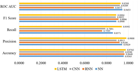 In recent years, DL algorithms have advanced significantly and some of the variants of DL algorithms have been successfully applied to solve classification tasks related to intrusion detection []. Therefore, we have considered simple Neural Network (NN), Recurrent Neural Network (RNN), Convolutional Neural Network (CNN), and Long Short-Term Memory (LSTM) algorithms because of their optimal performance. In the LSTM algorithm, we have used three hidden layers, and the union of hidden layers are 128, 100, and 64, respectively. The tanh is the hidden layer activation function and Adam is used as an optimizer. In addition, sigmoid is used as a network output activation function, and categorical_crossentropy is used as a loss function. Furthermore, both NN and CNN algorithms have used the same optimizer and activation function but a different type of hidden layer activation function. Particularly for the RNN model, the softmax is used as the network output activation function, and categorical_crossentropy is used as the loss function. On the other hand, for the CNN algorithm, the number of hidden layers is four and binary_crossentropy is used as the loss function. The dropout layer has been added after each layer to prevent model overfitting as RNN and LSTM generally have the problem of overfitting []. We have evaluated the selected DL models with a wide range of tested hyperparameters. We have obtained the optimal performance when we used these combinations of tested hyperparameters. Table 4 shows the hyper-parameter list of all the selected DL algorithms.