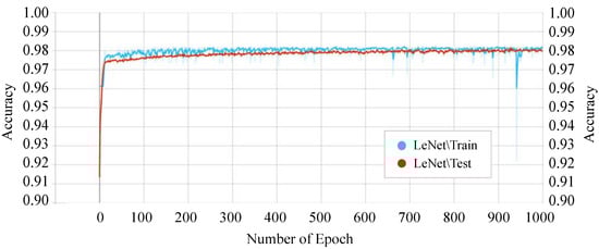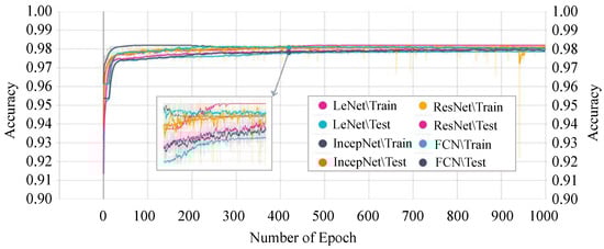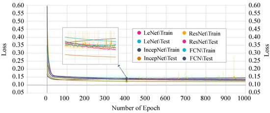 In addition, we would like to emphasize some DTL models that give better performance than others. We have considered four DTL models and the selected model are Fully Convolutional Networks (FCN), Inception Network (IncepNet), Residual Neural Network (ResNet), and our proposed LeCun Network (LeNet). For all the selected models, the hyper-parameters—batch size, hidden layer activation function, output layer activation function, loss function and the optimizer are 64, ReLu, softmax, categorical_crossentropy and Adam, respectively. Furthermore, FCN, IncepNet, and ResNet models have used the same number of hidden layers, but the units in the hidden layer are different. Particularly for the P-LeNet model, the number of the hidden layers is 2, and the units in the hidden layer are 5, 20. We have evaluated the selected DTL models with a wide range of tested hyperparameters. We have obtained the optimal performance when we used these combinations of tested hyperparameters. On the other hand, we have used the Adam optimizer for all the models because it combines the best properties of the AdaGrad and RMSProp algorithms to provide an optimization algorithm []. Furthermore, particularly for this analysis, the Adam optimizer has shown the lowest training loss and validation loss among other optimizers. Table 5 shows the hyper-parameters list of all the selected DTL algorithms.