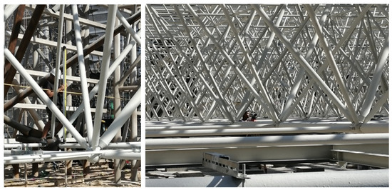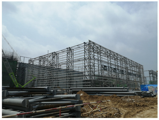 Research on the structural monitoring of long-span structures has mainly focused on two aspects: analysis control and monitoring methods. In terms of analysis and control, some scholars have developed monitoring systems to process monitoring data in order to analyze and control the construction process of long-span converter station steel structures [6,7]. Xiao et al. [8] established a long-span converter station steel structure health monitoring system that is suitable for cold conditions and treated the temperature parameters of the long-span converter station steel structure as mechanical parameters to guide the construction process. Zhang et al. [9] analyzed the use of optical fiber signals to further monitor long-span structures and proposed a long-span converter station steel structure monitoring system based on an optical fiber signal. However, the temperature and the fiber signal are greatly affected by the environment. To explore more accurate monitoring methods, Hu et al. [10] designed a long-span converter station steel structure axial force monitoring system based on a vibration sensor. According to string vibration theory, the monitoring frequency was converted into a cable force, and indirect measurement of the cable force of a long-span structure was realized at Tongwamen Bridge. Li et al. [11] established a long-span converter station steel structure monitoring system based on a pure circuit and analyzed and controlled the construction of a long-span structure by real-time analysis and processing of electrical signals. Commonly used monitoring methods mainly include automatic monitoring, manual measurement, and comparison with numerical simulation. Sun et al. [12] and Guo et al. [13] studied strain sensor data to monitor long-span converter station steel structures. Li et al. [14] proposed a method to monitor the deflection of a beam, inclination angle of a column, and displacement of a tenon joint in a structure with sensors. Based on the results of nonlinear finite element analysis, Hu and Su [15] derived an estimation formula for the confining pressure in a long-span converter station steel structure. Pagoulatou et al. [16] used the formula proposed by Hu and Su [15] to simulate the mechanical properties of a long-span converter station steel structure. Liang [17] determined the correct formula from the three formulas given by Hu and Su [15] to accurately calculate the confining pressure of a long-span converter station steel structure. Hassanein et al. [18] and Wang et al. [19,20] used the finite element method to predict the compressive performance of a long-span converter station steel structure. Wang et al. [19,20] predicted the bearing capacity of a long-span converter station steel structure by numerical simulation. Other scholars carried out long-term manual measurements for long-span structural engineering. Robertson [21] carried out 9-year manual measurements for the North Halawa Valley Viaduct on the Hawaiian island of Oahu, while Bazant et al. [22] compiled an 18-year field measurement report for the Koror Babeldaob Bridge.
