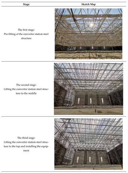 The longer the span of a converter station steel structure, the more serious the bending deformation, and the higher the risk of fracture or collapse. Globally, many engineering disasters have been caused by the fracturing of converter station steel structures during hoisting [1,2,3]. Deflection, stress, and strain are important mechanical parameters to monitor during the bending failure of long-span structures. Some scholars have performed a considerable amount of research on the structural monitoring of long-span converter station steel structures [4,5]. There have been few long-span converter station steel structure projects worldwide, and, as such, no relevant hoisting experience can be referenced. To avoid the occurrence of disasters in the hoisting process of long-span structures, it is necessary to carry out real-time structural monitoring of the hoisting process.