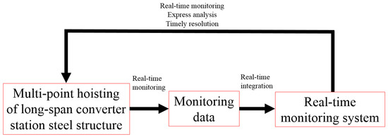 Therefore, compared with traditional monitoring methods, the real-time structural monitoring system can save time and money, as well as greatly reduce the engineering risk. It is necessary to apply such a monitoring system for long-span converter station steel structure hoisting. As the frontier research considering a multi-point hoisting monitoring system for a long-span converter station steel structure, this work can provide not only a reference for the planning of multi-point hoisting for other long-span converter station steel structures but also technical guidance and support for the existing monitoring mode of short- and medium-span converter station steel structure hoisting. Thus, the presented research results are applicable to all converter station steel structures.