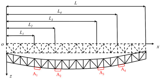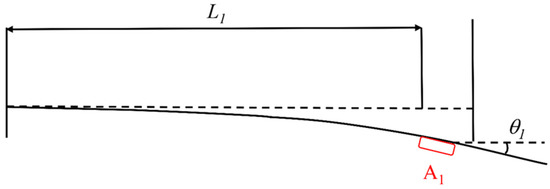 Take point o as the origin, the vertical direction as the z-axis, and the horizontal direction as the x-axis. The abscissae of the four inclinometers A1, A2, A3, and A4 are L1, L2, L3, and L4, respectively. When the long-span steel structure is forced to bend, the inclinometer will produce acceleration. Through the inclinometer, the bending angle, θ, of the long-span converter station steel structure was obtained in order to further obtain the deflection of the long-span converter station steel structure, as shown in Figure 6. The measuring range of the horizontal single-axis inclinometer was ±30°, and the accuracy was 0.01°.