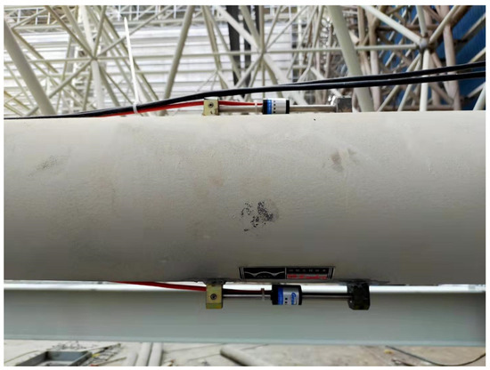 Vibrating wire surface strain gauges were used to measure the strain of the long-span converter station steel structure. Vibrating wire surface strain gauges D1 and D2 were installed on the cross-section of the converter station steel structure in order to monitor the strain changes during the hoisting process of the converter station steel structure. In total, 66 strain gauges were installed on the converter station steel structure. The measuring range of the vibrating wire surface strain gauge was ±1500 με, and the accuracy was 0.1 με, as shown in Figure 7 and Figure 8.