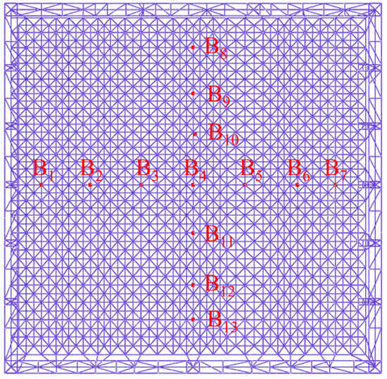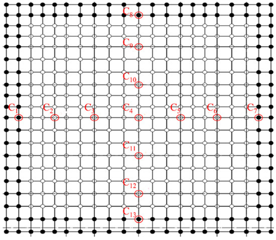 Thirteen control points were selected at the bottom of the hoisted steel structure to obtain the deflection and stress. The selected points are shown in Figure 14.