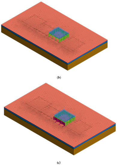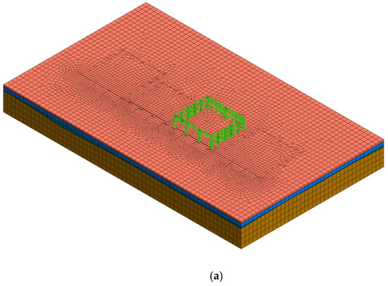 In the meshing part, the order of 1D–2D–3D was followed, which is conducive to the generation of nodes from one dimension to three dimensions and prevents the operation from non-convergence. The boundary constraints were divided into two parts: pile constraints and global constraints.