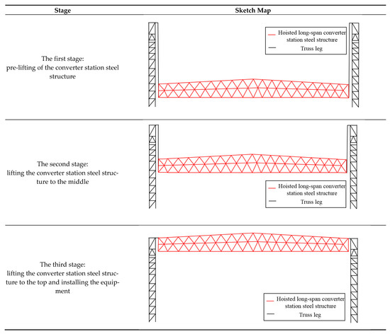 The hoisting of the long-span converter station steel structure is divided into three stages: Pre-lifting of the converter station steel structure, lifting of the converter station steel structure, and lifting of the converter station steel structure to the top, and installation of the 322.7 t of equipment, as shown in Figure 2. In this paper, structural monitoring of the long-span converter station steel structure during the hoisting process is carried out using automatic monitoring and manual measurement, and the results are compared with numerical simulation results.